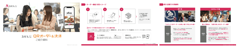 「ユビレジ QRオーダー&決済」の操作イメージ、導入メリット、導入までの具体的な流れをご紹介しています。